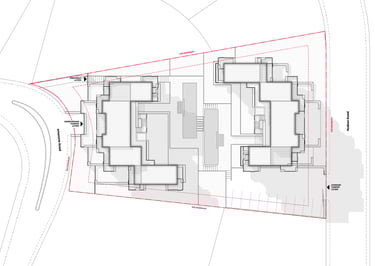 Located in Porto Maho, overlooking the airport of Sint Maarten on one side and the island's lagoon on the other, this contemporary residential project is composed of two twin buildings strategically positioned at slightly different elevations. The first structure sits alongside Amazone Road, while the second is slightly elevated along Hudson Road, each enjoying a separate and private entrance. To ensure direct access to both buildings, the development integrates a dual parking system: an underground garage accessible from Amazone Road, and an exterior parking lot connected to Hudson Road. Both parking areas directly link to their respective buildings, offering convenience and discretion for residents.