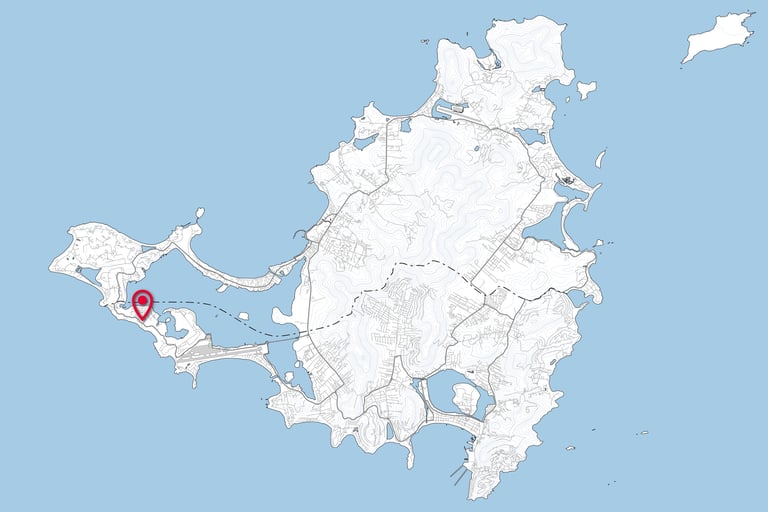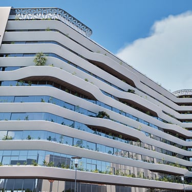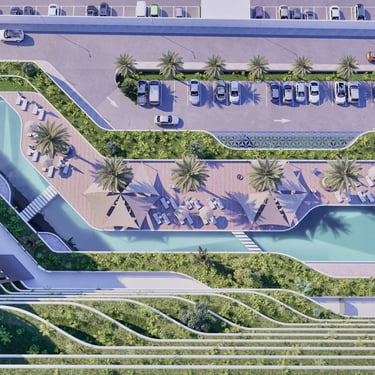 Grâce à son emplacement privilégié, le bâtiment devient naturellement un repère iconique pour tous les voyageurs arrivant sur l'île par avion. En effet, son allure élégante et ses lignes architecturales sont directement inspirées du design des yachts, captant immédiatement les regards. L'utilisation de courbes fluides avec la végétation en façade, accentue cette sensation d’osmose entre terre, mer et ciel, conférant ainsi à l’édifice une identité forte et intemporelle.