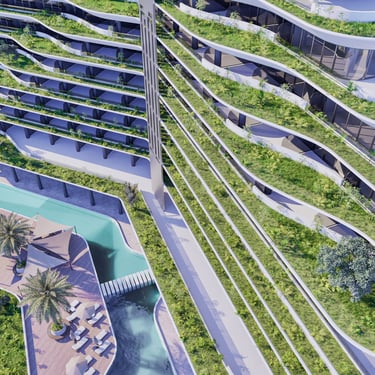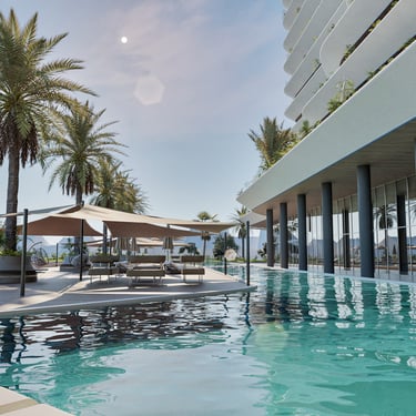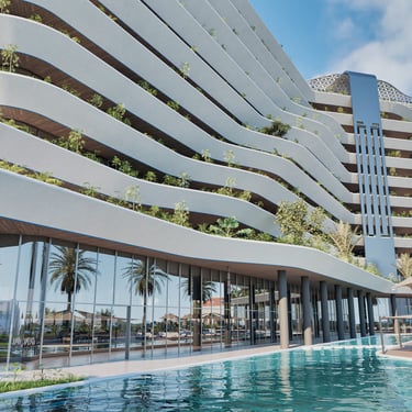 Mais cet habillage végétal n’est pas qu’esthétique, il joue également un rôle clé dans le confort thermique du bâtiment. En filtrant et rafraîchissant la brise marine avant qu’elle ne pénètre dans les chambres, la végétation contribue naturellement à la régulation des températures intérieures, réduisant ainsi le recours à la climatisation et limitant l’empreinte carbone de l’hôtel. De plus, des pergolas en aluminium aux motifs ajourés ainsi que deux éléments verticaux iconiques renforcent l’élégance contemporaine du complexe tout en offrant une protection efficace contre le soleil caribéen.