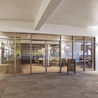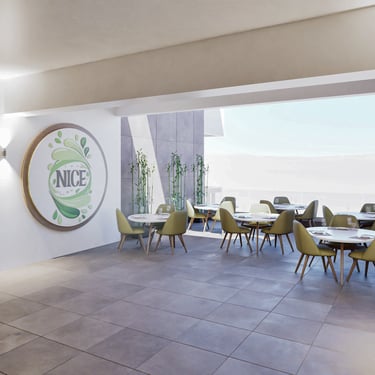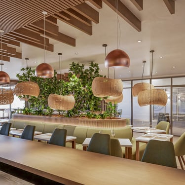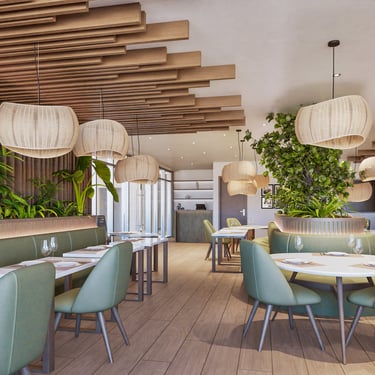 La végétation occupe une place centrale dans ce projet et renforce le lien profond avec la nature. Des plantes majestueuses bordent l'une des façades intérieures, tandis que d’autres jaillissent du cœur même de la salle, fusionnant subtilement avec son organisation spatiale. Ces touches végétales apportent une énergie vitale impressionnante, donnant au restaurant une impression de respiration en continu.