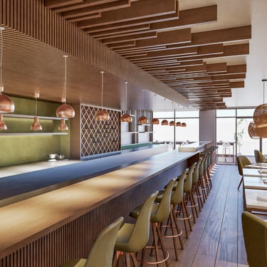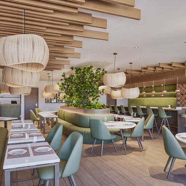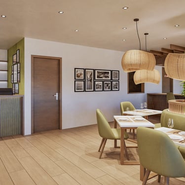 L’identité de Momohana repose avant tout sur un lien puissant entre confort et richesse sensorielle. L’utilisation généreuse du bois – habillant plafonds et murs à travers une variété de textures et de bardages claire-voie – insuffle une chaleur naturelle et une authenticité à l’espace. Cet élément naturel, allié à des textiles doux dans une douce palette de verts crèmes, crée une ambiance zen et enveloppante, invitant chaque convive à un moment de quiétude et de bien-être.