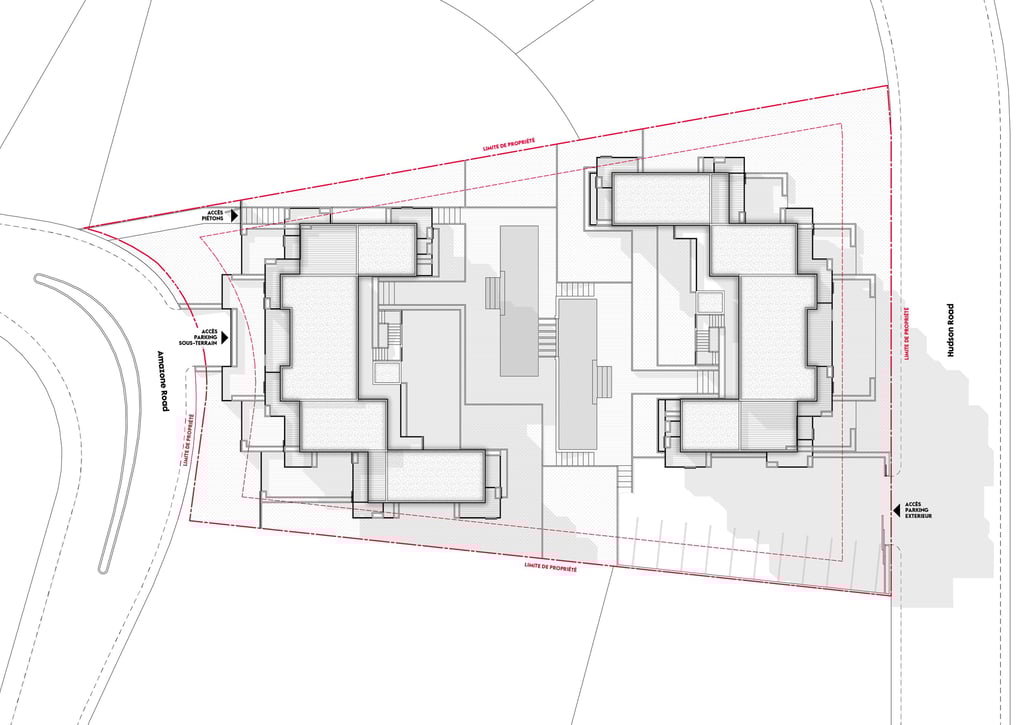Afin de faciliter l’accès aux deux structures, le projet intègre un système de stationnement double : un parking souterrain accessible depuis Amazone Road et un parking extérieur relié à Hudson Road. Chaque espace de stationnement est directement connecté au bâtiment adjacent, assurant un confort optimal et une discrétion absolue.
