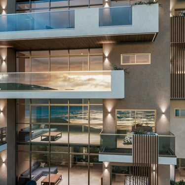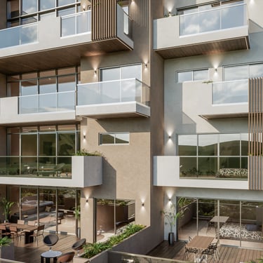 L’équilibre subtil entre les différents matériaux enrichit l’esthétique générale du complexe. De petites jardinières viennent ponctuer les balcons, apportant une touche végétale agréable, tandis que des éléments verticaux en bois permettent de créer une connexion entre certains balcons tout apportant un jeu de transparence et de profondeur aux façades des deux bâtiments. Les larges baies vitrées toute hauteur inondent chaque appartement de lumière naturelle, notamment grâce à un mur-rideau en façade principale qui accentue la sensation d’ouverture et de fluidité. Afin de préserver le confort thermique des appartements, toutes les surfaces vitrées bénéficient d'un revêtement anti-UV, protégeant efficacement du fort ensoleillement sans altérer l'éclairage naturel.